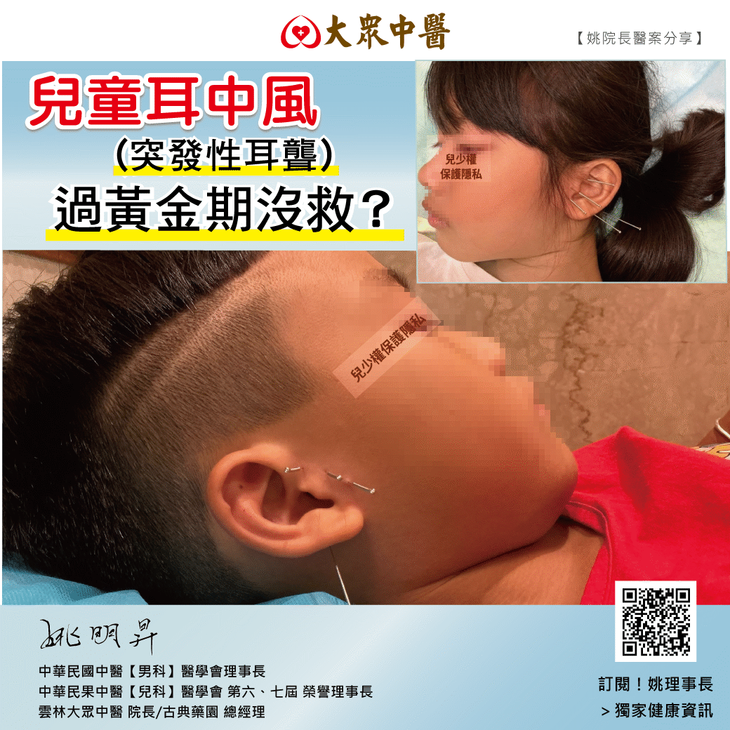 突發性耳聾在兒童身上,真的要積極採取中醫治療,因為那是一輩子的影響,看過很多案例小孩時一邊耳中風,成年又另一邊耳中風,最後雙側耳聾,人生至此真是不勝唏噓!